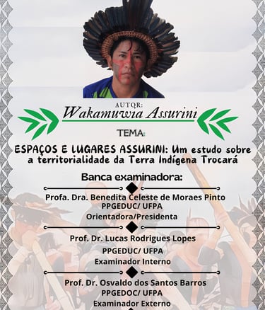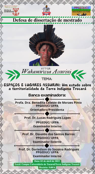 O professor Wakamuwia Assurini apresentará a dissertação "ESPAÇOS E LUGARES ASSURINI: um estudo sobre a territorialidade da Terra Indígena Trocará", cujo objetivo é compreender os conceitos matemáticos associados à cultura Assurini e trazer as contribuições da etnomatemática para a construção de atividades que integrem os conhecimentos matemáticos às práticas culturais indígenas na Escola Warara’awa Assurini. A defesa será às 9h.