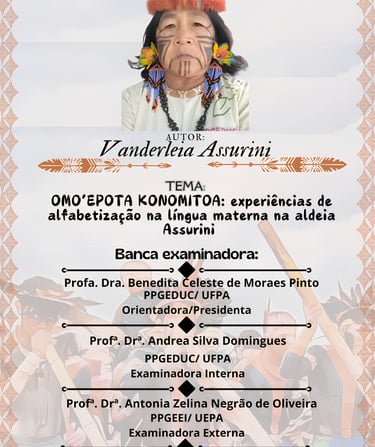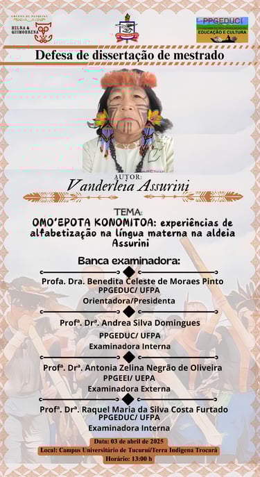 A professora Vanderleia Assurini defenderá sua dissertação, intitulada "OMO’EPOTA KONOMITOA: experiências de alfabetização na língua materna na aldeia Assurini", que busca demonstrar como se desenvolve o processo de alfabetização na língua materna dos alunos do 3º ano do ensino fundamental da Escola Indígena Warara’awa Assurini, destacando a importância da preservação da língua e da cultura no processo educativo. A defesa está marcada para iniciar às 13h.